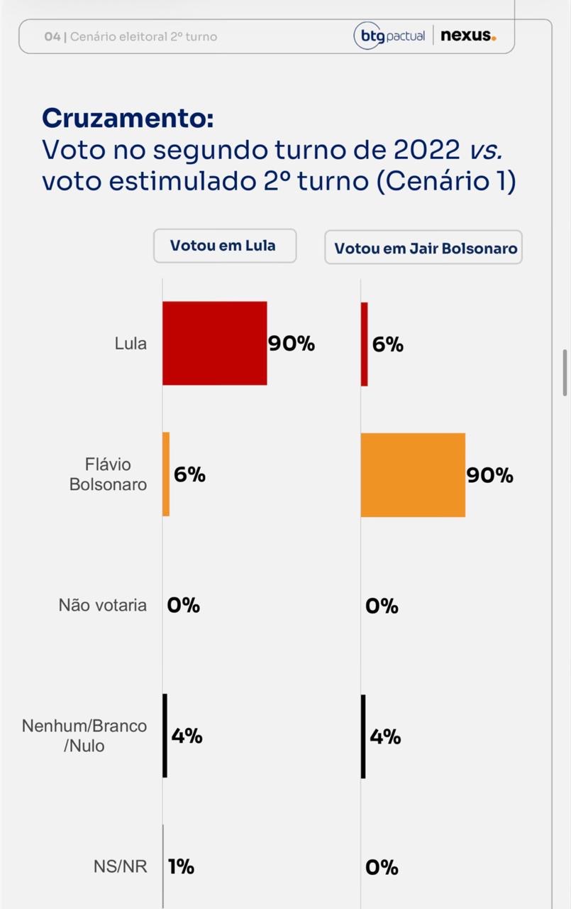 O presidente Luiz Inácio Lula da Silva (PT) e o senador Flávio Bolsonaro (PL) aparecem empatados em um cenário de segundo turno das eleições presidenciais de 2026, segundo a primeira rodada da pesquisa BTG Pactual/Nexus.